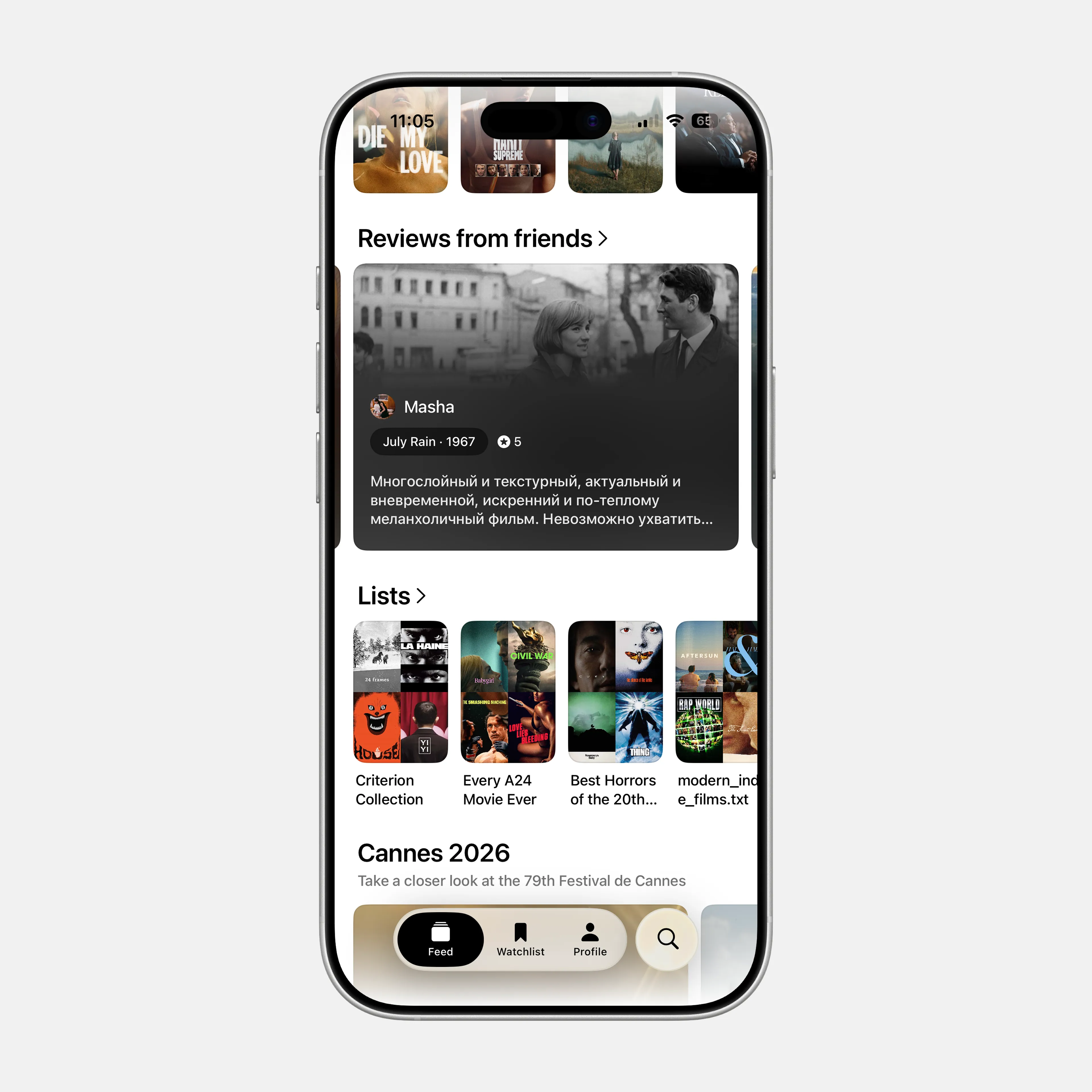 На главной Letterboxd есть несколько разделов – films / reviews / lists / journal – приложение открывается на первом (films). Немного полистав блоки с горизонтальным скроллом пользователь спускается вниз и очень скоро упирается в конец ленты. Некоторые пойдут листать следующие разделы, но все же большинство пользователей так и закончат свое “путешествие” на первом.